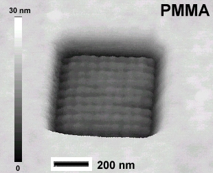 (STXM) 5.3.2 WHAT: Low dose & chemical development shows STXM-based patterning achieves 30 nm resolution The PhD thesis research of Jian Wang showed that tunable synchrotron light focused in a STXM can generate chemically selective patterns in multi-layer polymer structures [1,2]. However , the spatial resolution achieved was 150 nm or worse, due to radiation damage spreading and the need to use high doses to have sufficient contrast for STXM analysis. Adam Leontowich has found if patterns are generated by STXM and then chemically developed, much higher spatial resolution can be achieved - but the development is not actually needed to show high resolution. The figure shows an AFM image (Quescant 350) of a 10x10 shot damage pad burned into a 40 nm thin film of PMMA using a dose of 120 MGy (200 ms @ 11 MHz, 300eV) - prior to chemical development. Each individual damage exposure (30 ms) is visualized. With appropriate methodology patterns with features as sharp as the known spatial resolution of STXM (30 nm) can be made. OTHER INFORMATION: Chemically selective patterning has been