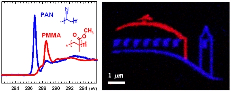 WHAT: The large differences in X-ray absorption among different polymers provides a mechanism to use the bright, monochromated, focused STXM beam for chemically selective soft X-ray lithography. Although secondary mechanisms (electrons and radicals) conspire to destroy the chemical selectivity by transferring energy among chemical species, this can be circumvented by use of appropriate radical barriers. In conjunction with pattern generation programs, we are writing multi-color patterns into polymer thin film structures: * to demonstrate this novel type of lithography,