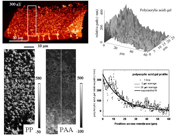 WHAT: Water Filtration Membrane chemical maps STXM provides a useful tool to map the chemical components of structured multi-component polymeric systems, with particular advantages for systems were hydration (or other solvation) is an essential part of the system, as well as for systems sensitive to radiaiton damage. The present study illustrates both advantages. WANT MORE INFORMATION ? Koprinarov et al. J. Physical Chemistry B 106 (2002) 5358-5364 or CONTACT Adam Hitchcock
