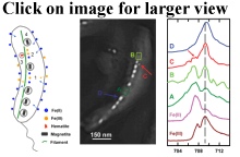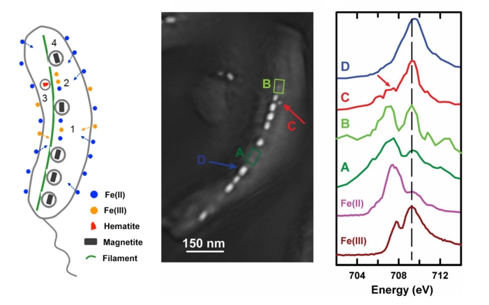 environment at the oxic-anoxic interface. At ALS beamlines 5.3.2.1 and 11.0.2, we have measured ptychographic absorption and phase spectra of magnetosomes (~40-50 nm in size) inside a single cell of a marine MTB (Magnetovibrio blakemorei strain MV-1). The spectra of mature magnetosomes, immature magnetosomes, precursor regions, and the gaps between magnetosome chains differ, indicaitng that different iron species can coexist in a single cell. From these results we proposed a model in which soluble Fe(II) is taken up from the environment, is partially oxidized to Fe(III), which in turn is then oxidized and transformed into hematite and ultimately into magnetite. In addition, ptychography ay BL 11.0.2 was used to measure the x-ray magnetic circular dichroism (XMCD) phase and absorption spectra of both extracellular and intracellular magnetosomes. Fe 2p XMCD probes the magnetism of magnetitein a site-specific manner. These experiments demonstrate that ptychography, which combines high spatial resolution, high-sensitivity chemical speciation, and site-specific magnetic information, offers a powerful probe for biomineralization studies. OTHER INFORMATION: Publication: X.H. Zhu, A.P. Hitchcock, D.A. Bazylinski, P. Denes, J. Joseph, U. Lins, S. Marchesini, H.-W. Shiu, T. Tyliszczak and D.A. Shapiro, Measuring spectroscopy and magnetism of extracted and intracellular magnetosomes using soft X-ray ptychography, Proc. Nat. Acad. Sci. 113 (51) (2016) E8219-E8227 doi:10.1073/pnas.1610260114 ALS Science Brief (published 14 Mar 2017) https://als.lbl.gov/ptychography-bacteriums-inner-compass/