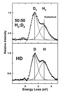 WHAT:  At large scattering angles (>60 deg) and moderate or high impact energies (>2 keV) the atoms of a gas phase molecule (or a solid) scatter the electron beam independently from their neighbours, resulting in quasi-elastic electron scattering which can give rise to peaks separated by several eV in energy. The positions of these peaks are accurately predicted by simple conservation of energy and momentum considerations (Rutherford formula). The intensity should be proportional to the square of the atomic number and number of that type of atom in the molecule. Thus the signal for HD and a 50:50 mixture of H2:D2 should be the same. However, our measurements show a 30% deficiency of intensity of H2 relative to HD or D2 (see figure). The origin of this anomaly is not yet determined, but may be related to quantum entanglement of the incident electron and target nucleus on the attosecond time scale of the scattering. Further studies are underway to see if this relatively simply macroscopic scattering measurement can provide insight into quantum entanglement and the process of decoherence