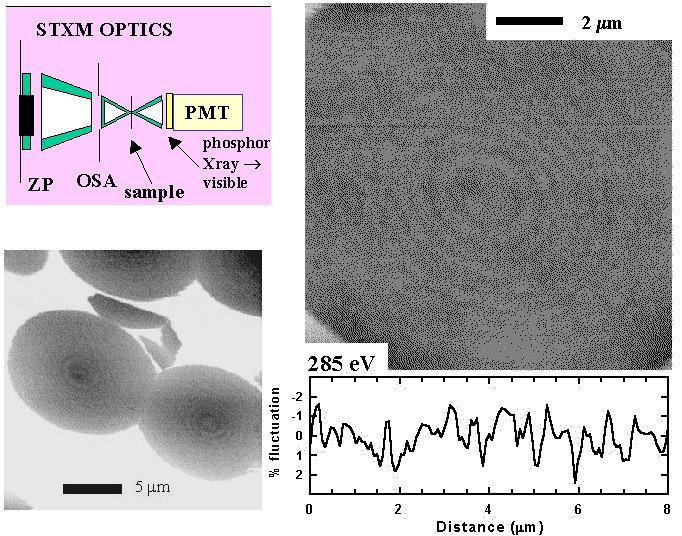 X-RAY MICROSCOPY of ‘ TREE-RING’ LATEX PARTICLES WHO: Adam Hitchcock, Harald Stöver, Yew-Meng Hing, BIMR, McMasterHarald Ade, NCSU WHERE: Advanced Light Source BL 7.0 Scanning Transmission X-ray Microscope (STXM) WHEN: 23 Dec 1998 POSTED: 18 Jan 1999 WHAT: A focussed 50 nm beam of highly monochromatic and tunable X-rays is used to make an image of a slice of a latex sphere only 100 nm thick. By varying the X-ray energy the chemical species can be identified and quantified. ![]() Selective energy images of a structured latex particle prepared by a single step synthesis. The 'tree-ring' structure,which is detected only at 285 eV, is associated with variable composition arising from oscillations in the polymerization reaction of the mixed, styrene, chloro-styrene system. Difference in the absorption ON versus OFF rings is only 2%. WANT FURTHER INFORMATION ? : CONTACT aph@mcmaster.ca