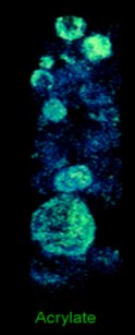 WHAT: An apparatus to allow rotation of samples at the focus of the X-ray beam in scanning transmission X-ray microscopy has been developed and used to measure three-dimensional chemical distributions with ~50 nm spatial resolution in 3-d. The sample is polymer latex microspheres in water, with each ~1 micron diameter polystyrene sphere enclosing low density polyacrylate (~2 wt-% of the solid). By measuring at 2 photon energies, the difference signal maps the acrylate. The first movie shows a fly through of a rendering of the quantitative 3-d chemical mapping of the whole system, with the water removed. The second movie isolates the signal from the acrylate and displays its 3-d distribution using green for more dense and blue for less dense voxels. This informaiton is useful to Dow chemists optimizing the acrylate filling of these microspheres, for use as a high performance coating component. REFERENCE: G.A. Johansson, T. Tyliszczak, G.E. Mitchell, M. Keefe and A. P. Hitchcock, Three dimensional chemical mapping by scanning transmission X-ray spectromicroscopy, J. Synchrotron Radiation 14 (2007) 395-402