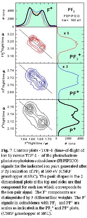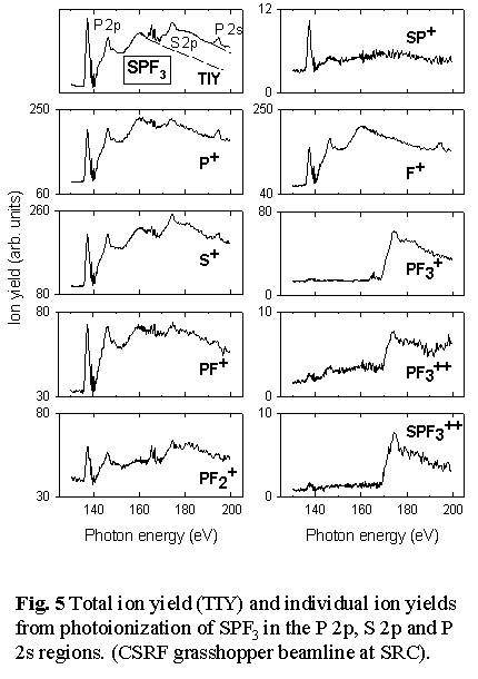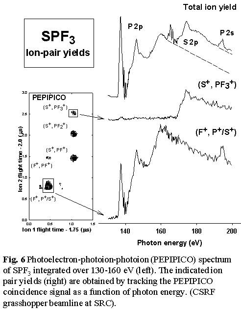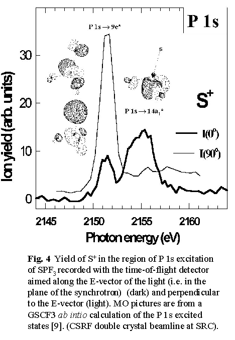 and thus the pathway of the decay [8]. We are using time-of-flight mass spectrometry and multi-stop coincidence techniques at the CSRF beamlines at SRC to investigate the core-excitation spectroscopy and dynamics of core state decay of small molecules. Fig, 4 shows a spectroscopy example from a recent study of SPF3 [9] in which the symmetry of core excited states is determined directly from the angular distribution of ionic fragmentation processes which lead to pairs (or triplets) of energetic ions. Basically, if bond breaking in an energetic ionic fragmentation occurs before the molecular orientation has had a chance to randomize by rotation, then the direction of preferential ion emission is closely related to the symmetry of the excitation. In this case, when the time-of-flight detector is aligned perpendicular to the electric vector of the light the P 1s ® 9e* transition dominates the S+ partial ion yield spectrum, whereas when the time-of-flight detector is rotated 90o to place the time-of-flight detector parallel to the electric vector, the P 1s ® 14a1* transition becomes strongest. By comparison, the total ion yield spectra and partial yield spectra of thermal ions from P 1s excited SPF3 show negligible angular anisotropy. Fig 4 also includes sketches of the molecular orbitals involved in these core excitations. The diagrams are derived from ab initio calculations of core excited states. Parallel experimental and computational studies are an integral part of synchrotron science, as in almost all other areas of chemistry and physics. Auger decay of inner-shell excited and ionized states is an efficient