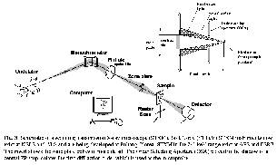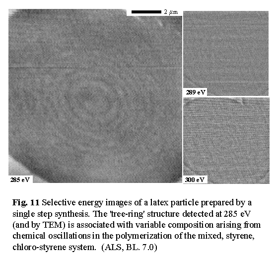 x= 0-2) flies directly away, while the peak to the lower right 2.B Materials Science Many of the applications of synchrotron light are in the area of high performance analysis of new materials. There is an old saying, 'you can't control what you can't see'. By pushing the frontiers of what can be analyzed - lowering spatial, temporal, precision, and detection limits - synchrotron light is contributing in diverse and significant ways to new material and new device development. By the year 2003 it is widely expected that semiconductor devices requiring the finest features - particularly microprocessors and high capacity memory chips - will use X-ray lithography based on synchrotron light in part of their manufacture. Total reflection X-ray fluorescence analysis - a photon in - photon out technique - is being developed as a key technique to monitor contamination of semiconductor surfaces, an issue which becomes increasingly critical as device dimensions shrink. In the area of analytical sciences, synchrotron light is greatly enhancing the capabilities of well-established techniques such as X-ray photoelectron spectroscopy, and also leading to the development of new techniques, such as resonant inelastic X-ray scattering [13], zone-plate based X-ray spectromicroscopy [14], and extended X-ray absorption fine structure (XAFS) [2,15]. Some of our recent work in zone plate microscopy is described below to illustrate only one aspect of the exciting new materials science enabled by synchrotron light. Fig. 8 shows a schematic of a scanning transmission X-ray microscope (STXM) [14]. It uses a small X-ray spot created by focussing monochromatized x-rays with a Bragg-Fresnel zone plate, which is a circular transmission diffraction grating with a variable line spacing. The zone plate uses only the spatially coherent component of the X-rays with which it is illuminated so the high brightness and partial coherence of third generation undulator light is critical to their performance. In addition, the fabrication of soft X-ray zone plates pushes the limits of modern electron beam mask generation and lithographic techniques so the spatial resolution is closely related to how fine and precise the zone plate structure can be made. Images are produced pixel by pixel by raster scanning the sample through the beam while recording a suitable signal such as transmitted flux (STXM), fluorescent X-rays, luminescence, or photo-ejected electrons (SPEM) In STXM the sample is located in an atmospheric pressure helium enclosure, a vacuum, or in a liquid contained within X-ray transparent windows. Imaging with the photon energy tuned to chemically-specific spectral features provides chemical maps. Alternatively, the photon energy can be scanned to acquire a Near Edge X-ray Absorption Fine Structure (NEXAFS) spectrum from a small area. Recently procedures to acquire sequences of full images at many photon energies have been implemented (see core-shell particles, toner particles, protein-on-polymers, or jacobsen web site for examples). The acquisition of an image sequence is an extremely powerful way of studying samples which has already provided many interesting surprises, revealing aspects of sample chemistry that would not have been discovered by other means. So what is new ? - what does X-ray spectromicroscopy offer, that