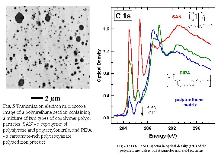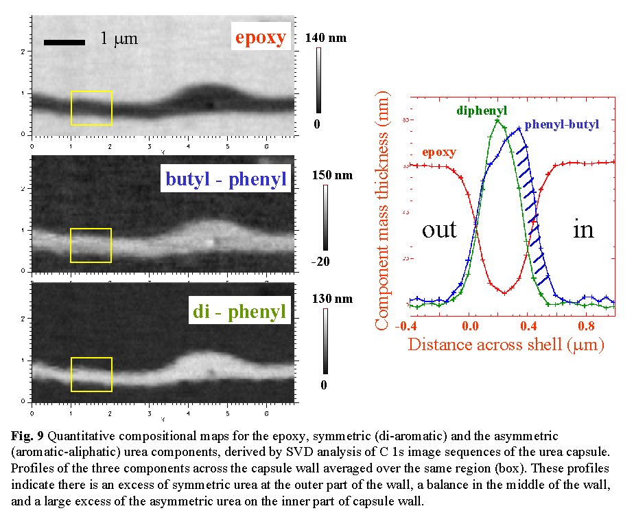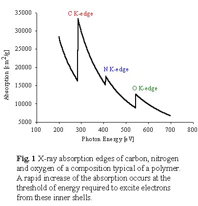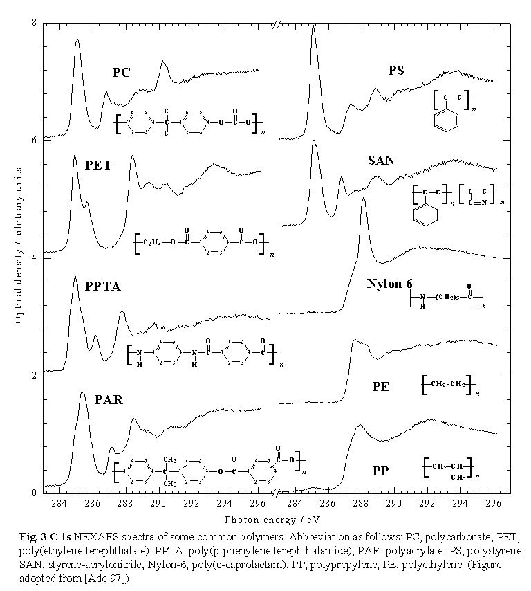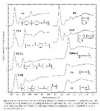 molecular structures, as shown in Figure 3 There is characteristic NEXAFS structure at the absorption edge of each element in a sample. Thus combined studies of C 1s, N 1s and O 1s NEXAFS is a very powerful tool in polymer analysis. Finally, comparisons with NEXAFS spectra of pure standards provides a means to derive quantitative composition maps of the components of a complex material from a series of X-ray microscopy images.