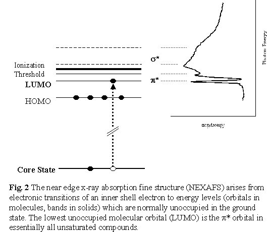 materials [ade 98, ade00] and biological [kirz 95] applications. There are many problems in polymer physics and chemistry which require detailed chemical analysis at a sub-micron spatial scale - phase segregation; determination of the morphology and interface chemistry of blends and co-polymer systems; nano-patterned structures, self assembly; and many others. ‘Traditional’ chemical spectroscopies used for polymer studies such as infrared and nuclear magnetic resonance can differentiate chemical species but they do not have the necessary sub-micron spatial resolution. Analytical transmission and scanning transmission electron microscopy have excellent spatial resolution and are very useful to visualise the structure, but electron microscopy typically does not have sufficient chemical sensitivity for quantitative chemical mapping beyond the elemental level. In many cases it is ambiguous whether structure observed by electron (or optical) microscopy arises from chemical differences or if it is simply caused by density/thickness variations or reflectivity changes (optical). In addition, electron microscopy of polymers is experimentally difficult on account of high rates of radiation damage by energetic electron beams [Egerton 87]. 2. Near Edge X-ray Absorption Fine Structure As an x-ray passes through matter, it is absorbed to an extent which