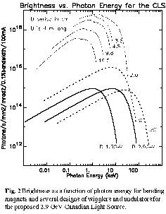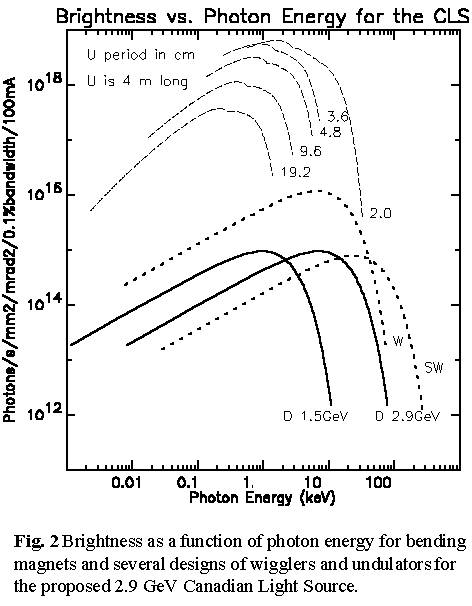 Fig. 2 plots the brightness as a function of photon energy of bending magnets and various wiggler and undulator devices planned for the Canadian Light Source (CLS).