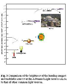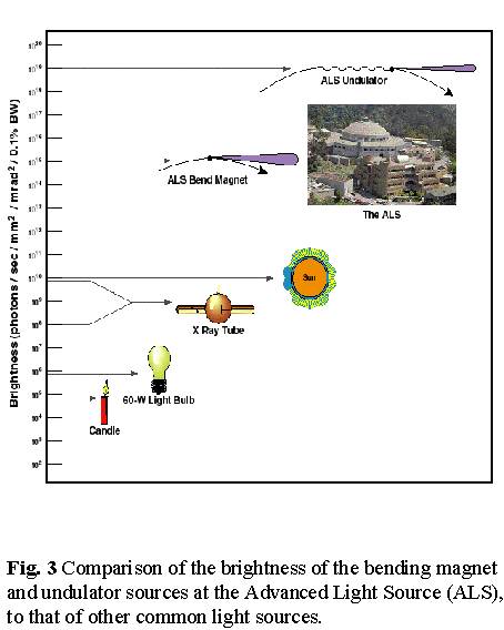 Fig. 3 compares average brightness of bending magnet and undulator light from the Advanced Light Source (ALS) to that of other light sources, such as an X-ray tube and the sun. The impact of third generation synchrotron light in the 1990's is conceptually very similar to that of laser light in the 1970's. At present there is much activity in designing and developing novel types of insertion devices with properties optimized for special experiments. At third generation light sources, there is an ongoing dialectic between the accelerator physics and the synchrotron light experimentation, since both aspects need to be optimized simultaneously to obtain the best results. Details of the physics of synchrotron light production [1], and applications are available in many books [2], journal articles and popular reports [3].
